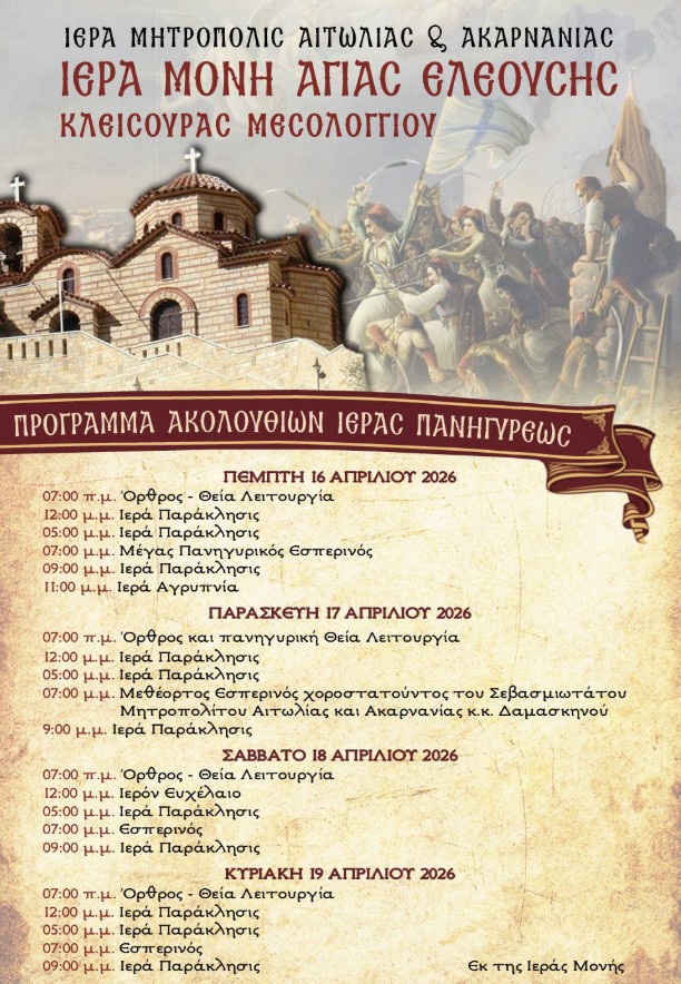 Με τη δέουσα λαμπρότητα και επισημότητα εορτάζει και πανηγυρίζει αύριο Παρασκευή 17 Απριλίου 2026 η Ιερά Μονή Ζωοδόχου Πηγής (Αγίας Ελεούσης) Κλεισούρας Μεσολογγίου.