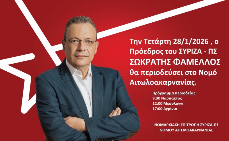 Την Τετάρτη 28 Ιανουαρίου 2026 επισκέπτεται την Αιτωλοακαρνανία ο Πρόεδρος του ΣΥΡΙΖΑ – Προοδευτική Συμμαχία, Σωκράτης Φάμελλος, στο πλαίσιο περιοδείας του στην περιοχή.