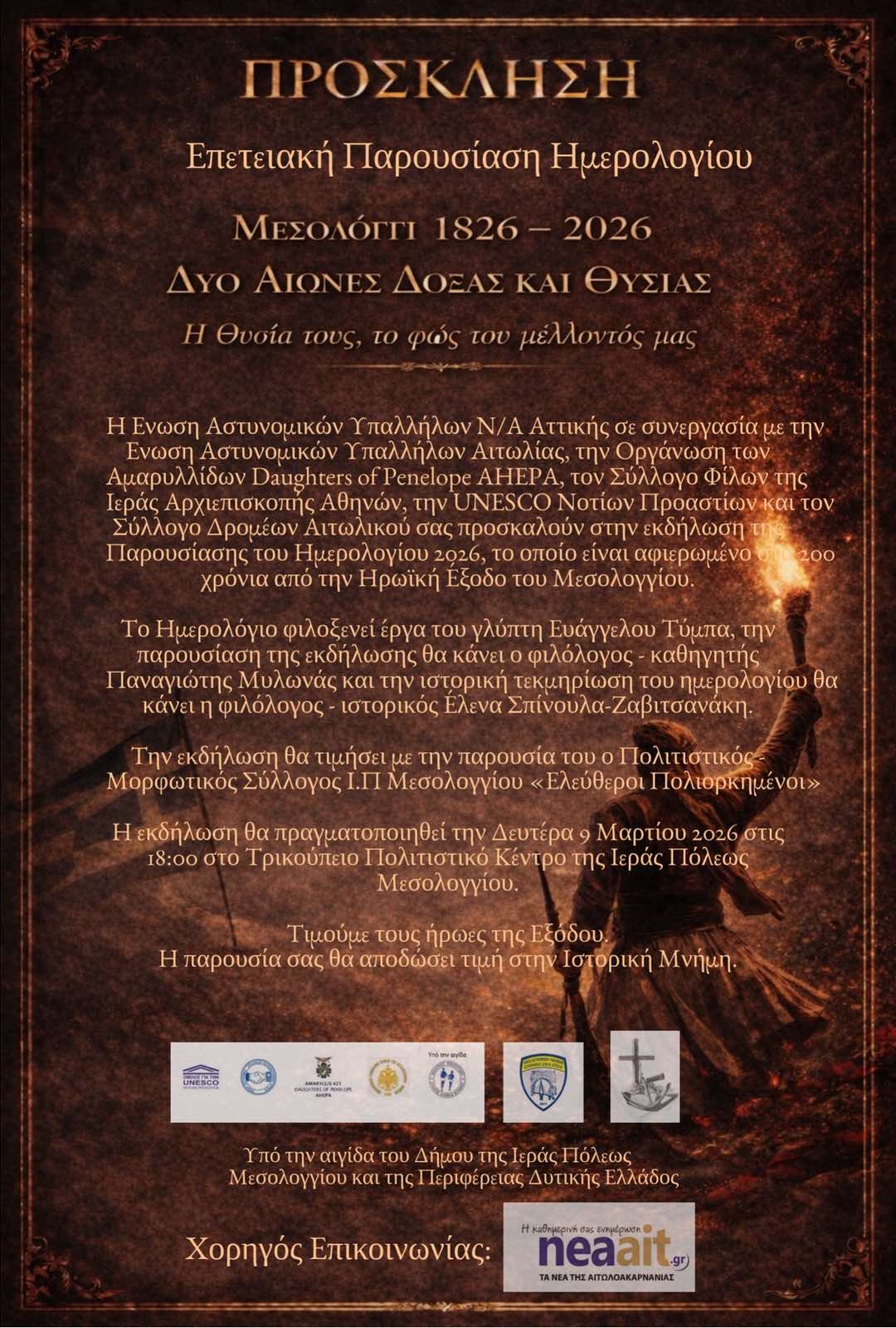 Η Ένωση Αστυνομικών Υπαλλήλων Νοτιοανατολικής Αττικής, σε συνεργασία με την Ένωση Αστυνομικών Υπαλλήλων Αιτωλίας, διοργανώνει την επίσημη παρουσίαση του Ημερολογίου για το έτος 2026, με τίτλο «Μεσολόγγι 1826-2026: Δύο Αιώνες Δόξας και Θυσίας – Η θυσία τους, το φως του μέλλοντός μας» με έργα του γλύπτη Ευάγγελου Τύμπα.